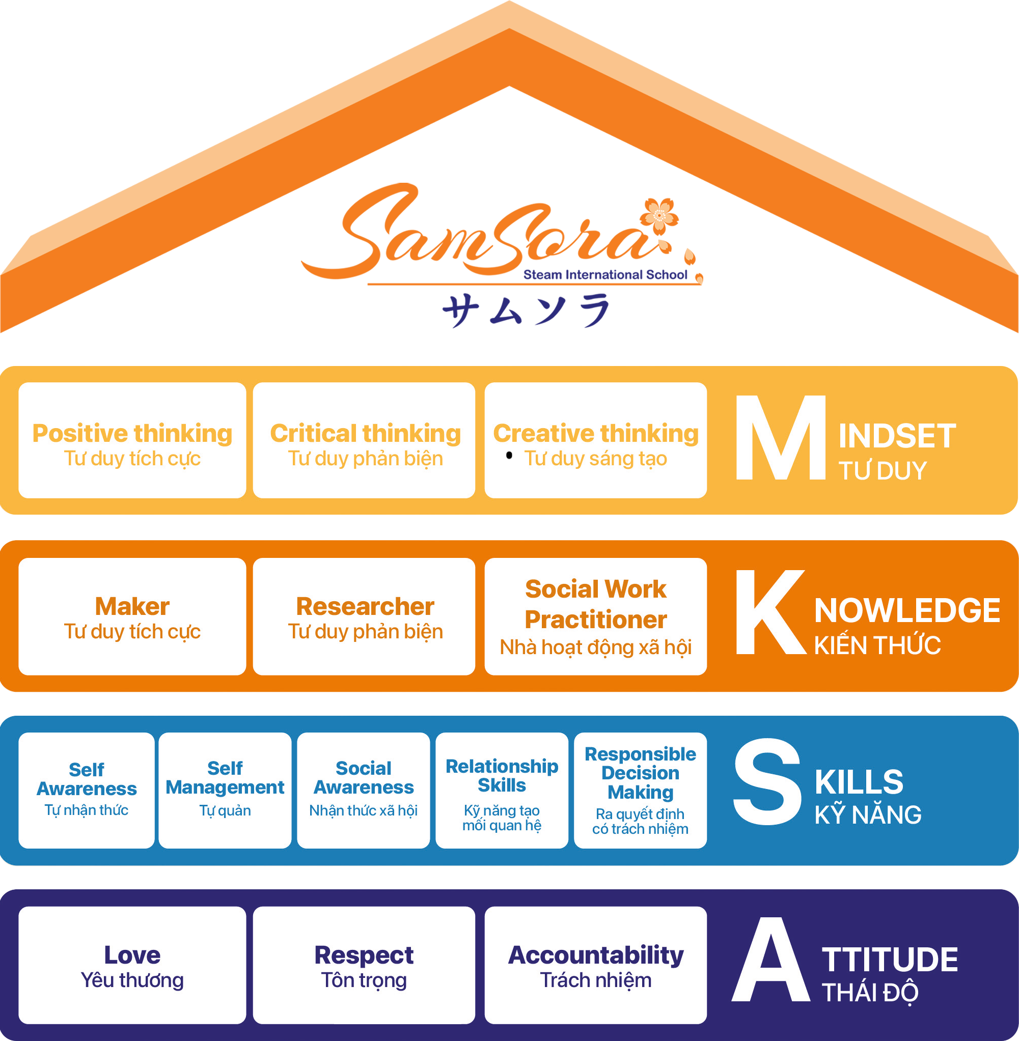 Attitude – Thái độ: Samsora luôn đồng hành cùng gia đình để những công dân tương lai luôn thấu hiểu và lan tỏa giá trị cốt lõi “Yêu thương – Tôn trọng – Trách nhiệm”.